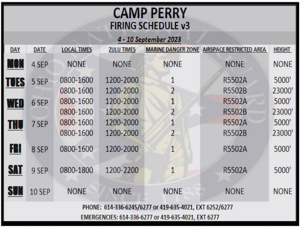 Back to All Events Camp Perry Firing Range SchedulE Monday, September 4, 2023 9:00 AM Sunday, September 10, 2023 5:00 PM Google Calendar ICS