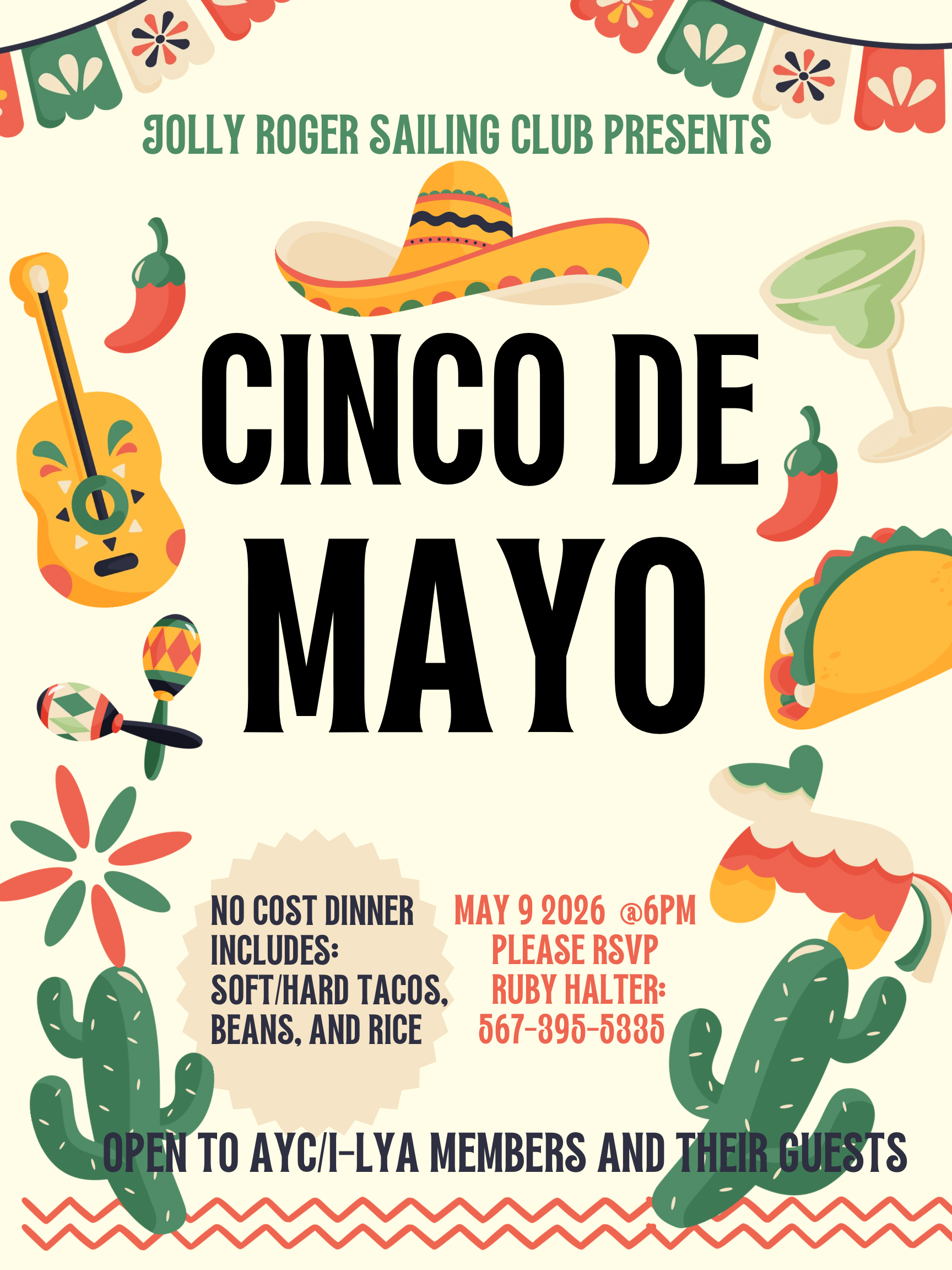 Back to All Events Cinco de Mayo Saturday, May 9, 2026 6:00 PM 8:00 PM Jolly Roger Sailing Club 5961 Edgewater Drive Toledo, OH, 43611 United States (map) Google Calendar ICS Cinco de Mayo at Jolly is calling…Join us for a festive night of tacos, drinks, and good company at the club!Complimentary dinnerSoft & hard tacos, beans & riceMay 9 @ 6PMOpen to members + guests—bring your crew and your appetite.Please RSVP to Ruby Halter: 567-395-5836